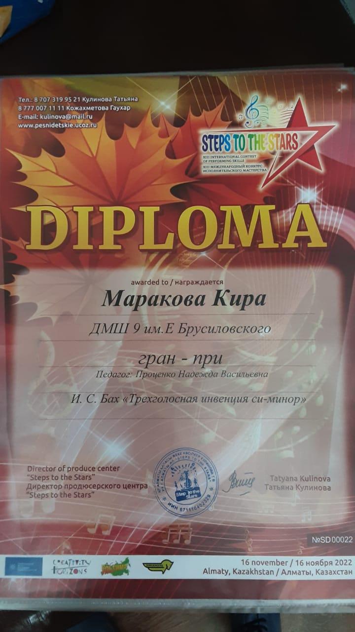 22 ноябрь 2022 0 1 2 3 4 5 Оқушылар жетістіктері 4 "Е" сынып оқушысы Маркова Кира халықаралық атқарушы шеберлік байқауында бас жүлдеге ие болды. Ученица 4 "Е" класса Маркова Кира получила гран при в Международном конкурсе исполнительного мастерства.