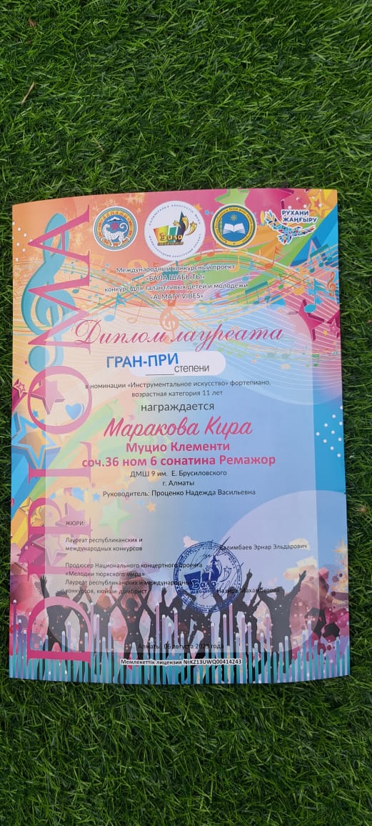 Ученица 5 "Е" класса Маракова Кира заняла в международном конкурсном проекте "Бала шабыт" гран-при в номинации "Инструментальное искусство", фортепиано.
