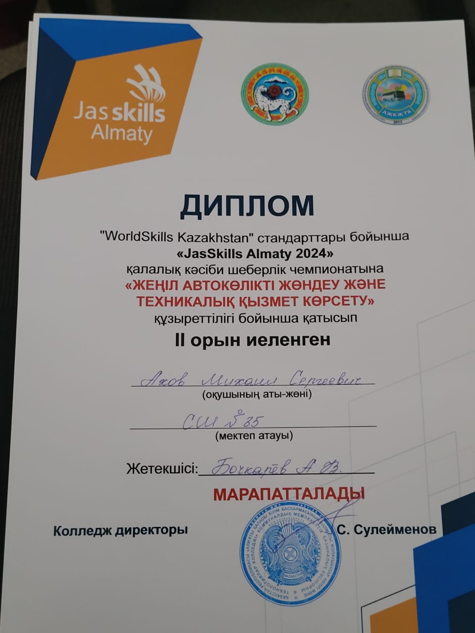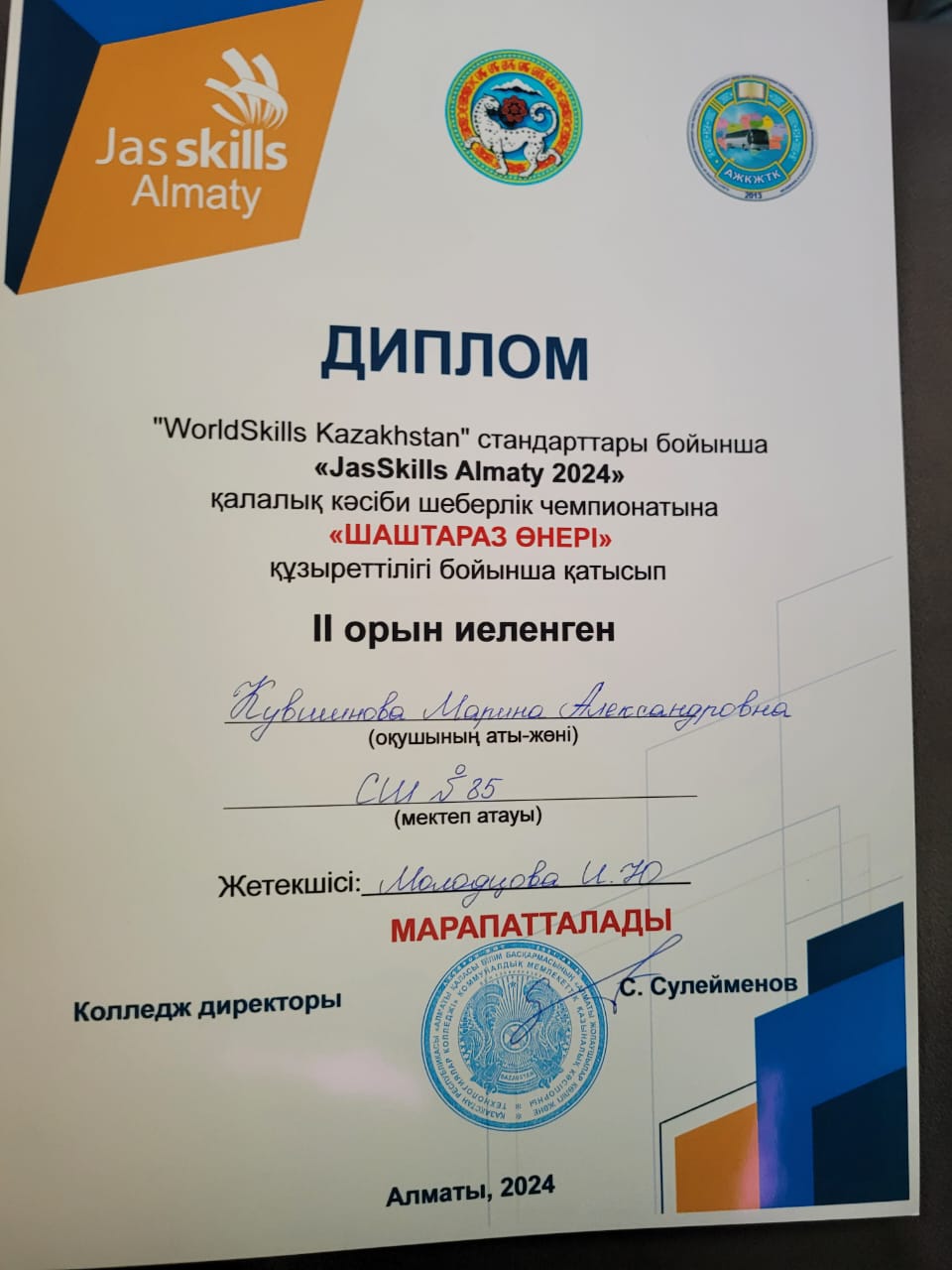 19 декабрь 2024 0 1 2 3 4 5 Оқушылар жетістіктері "WorldSkills Kazakhstan" стандарттары бойынша "JasSkills Almaty 2024" кәсіби шеберлік байқауының жүлдегерлері. Призёры конкурса профессионального мастерства "JasSkills Almaty 2024" по стандартам "WorldSkills Kazakhstan".