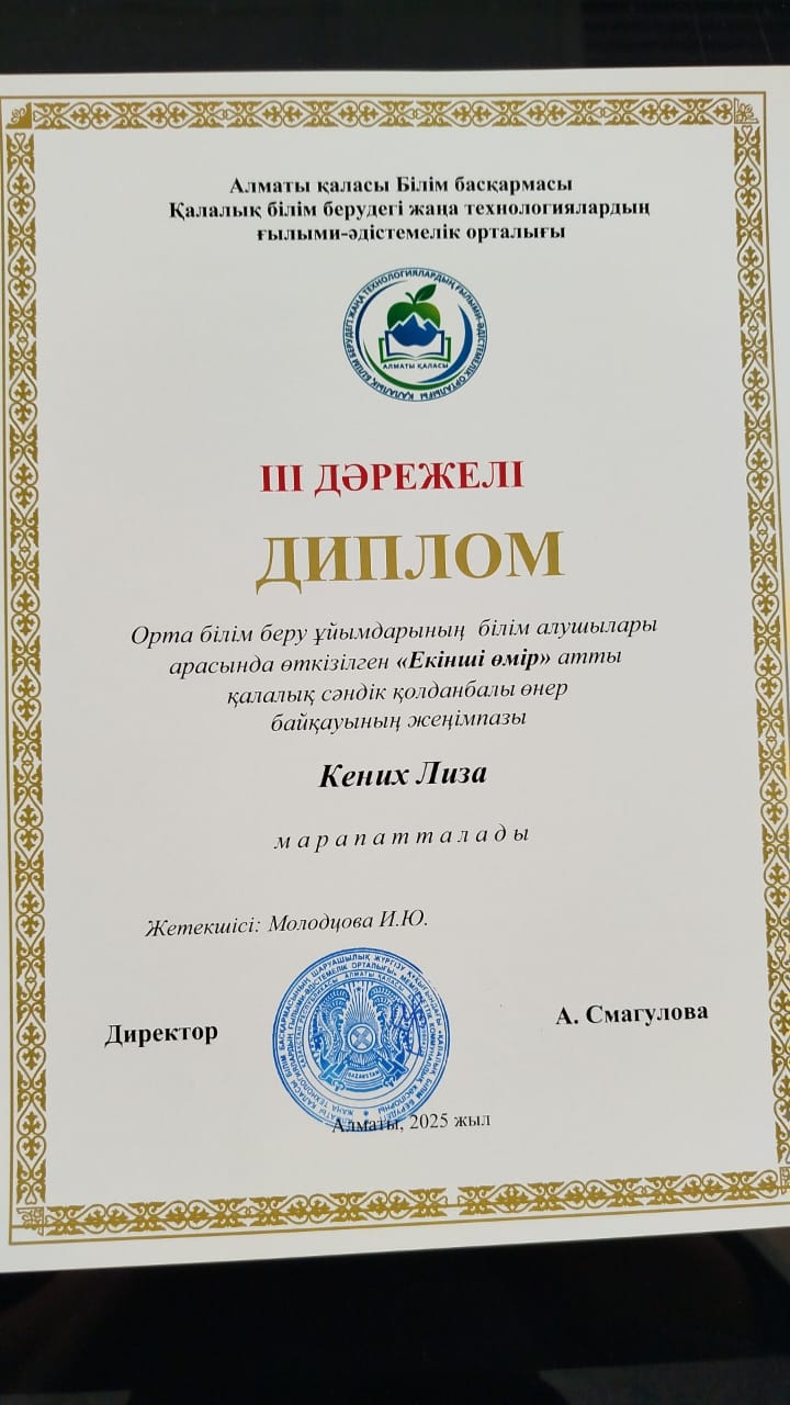 12 декабрь 2025 0 1 2 3 4 5 Оқушылар жетістіктері "Екінші өмір" қалалық сәндік-қолданбалы өнер байқауы. Басшы Молодцова Ирина Юрьевнаны құттықтаймыз.Городской конкурс декоративно- прикладного искусства "Вторая жизнь". Поздравляем руководителя - Молодцову Ирину Юрьевну.