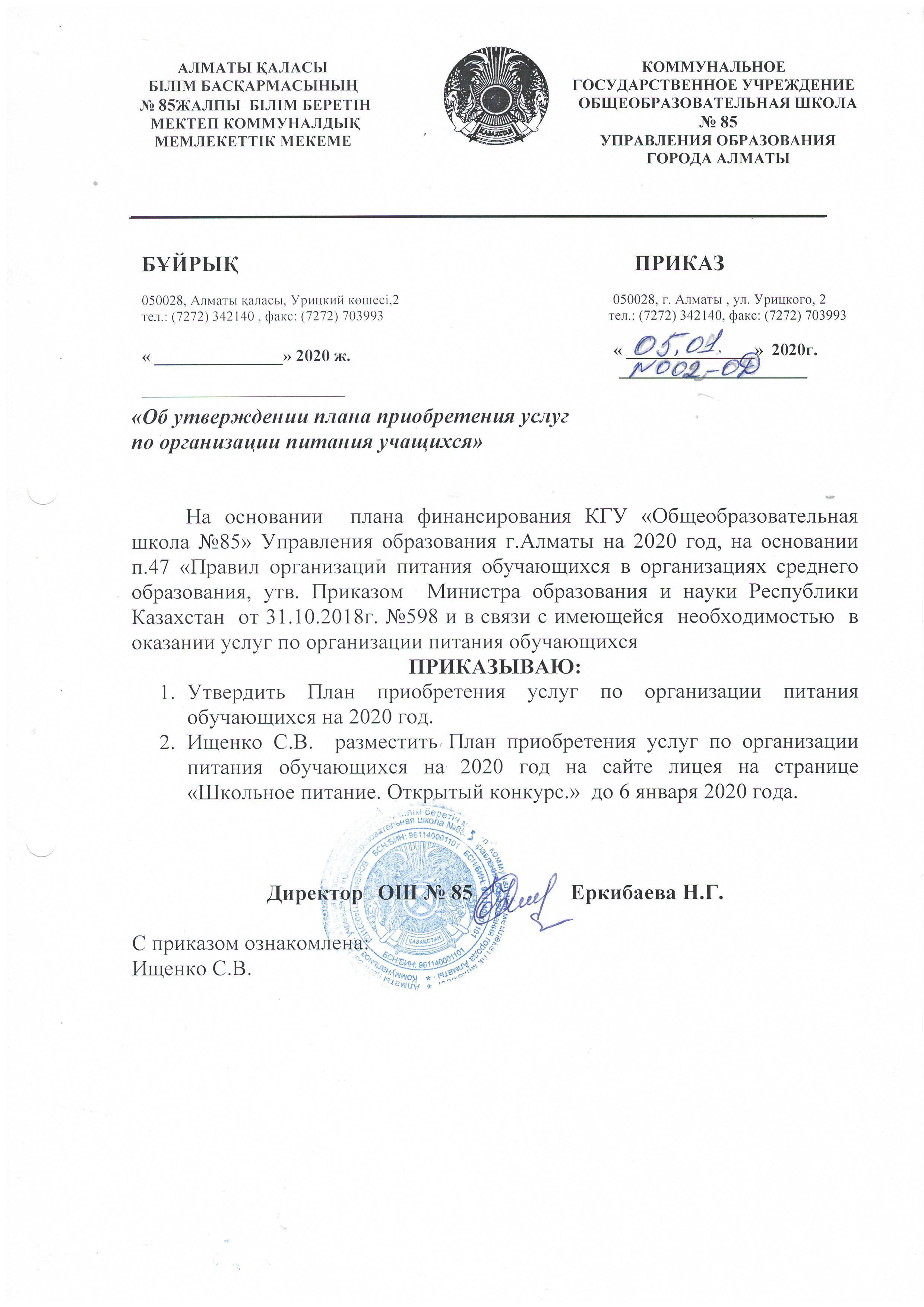 Об утверждении плана приобретения услуг по организации питания учащихся » №85 Орта мектеп