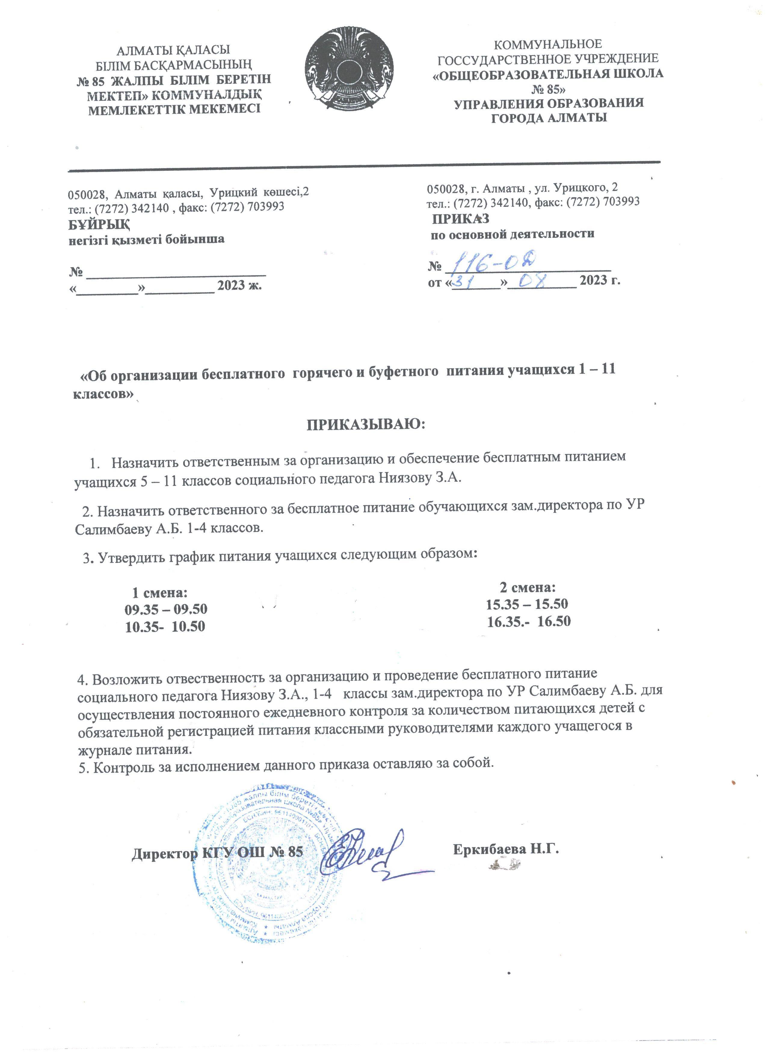 31 август 2023 0 1 2 3 4 5 1-11 сынып оқушыларына ыстық және буфеттік тамақтандыруды ұйымдастыру туралы бұйрық