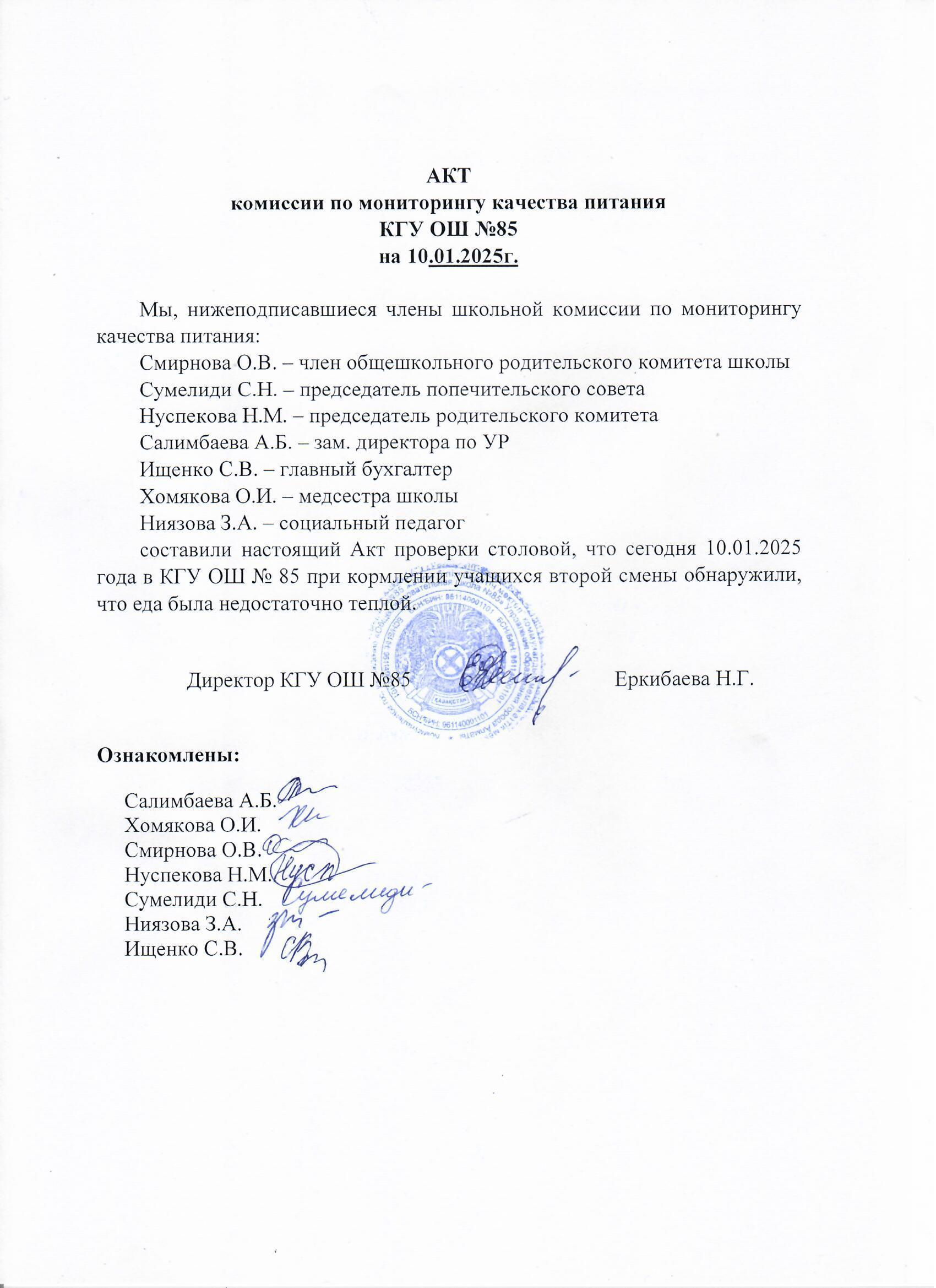 Тамақтану сапасының мониторингі жөніндегі комиссияның актісі » №85 Орта мектеп
