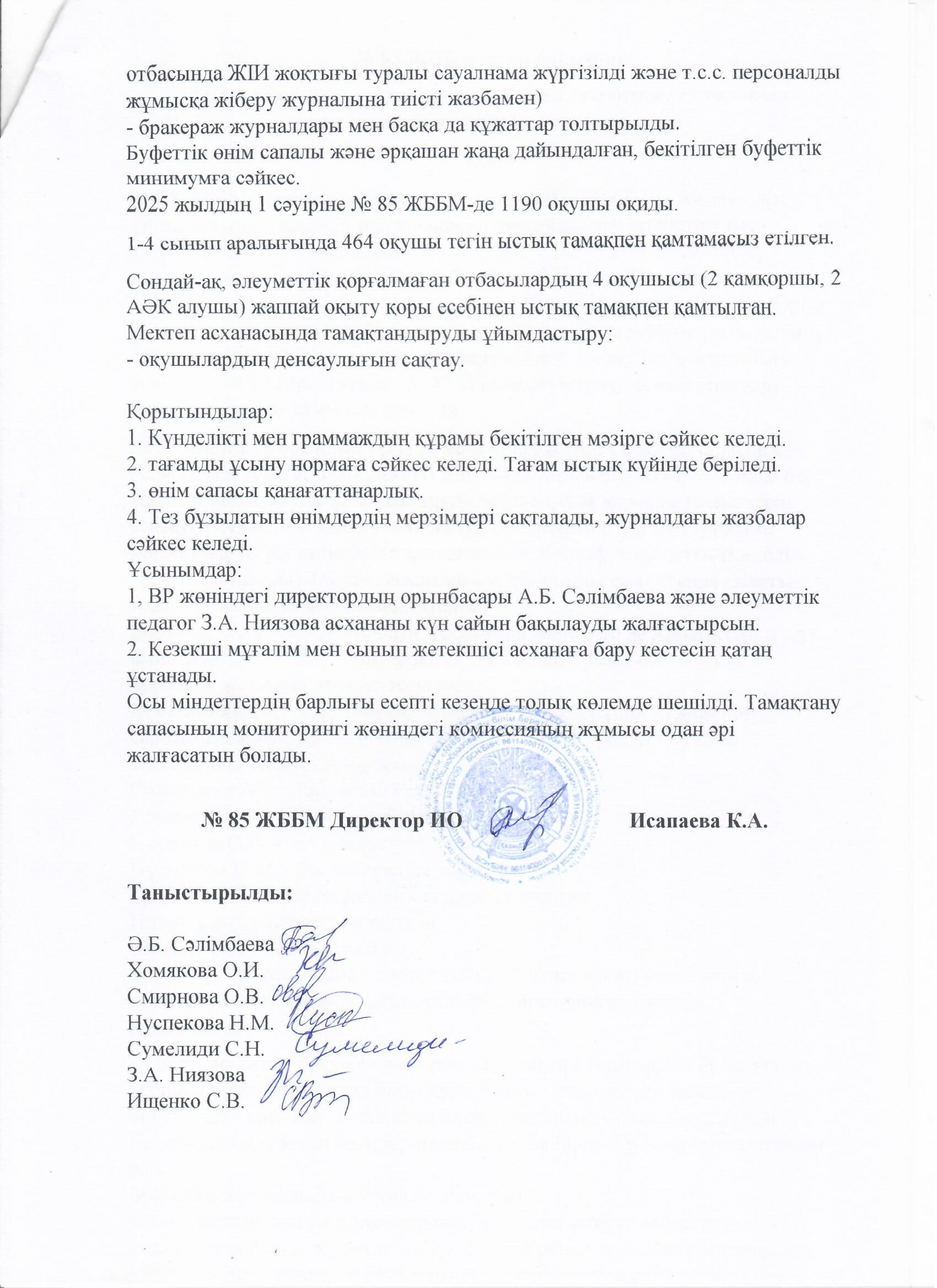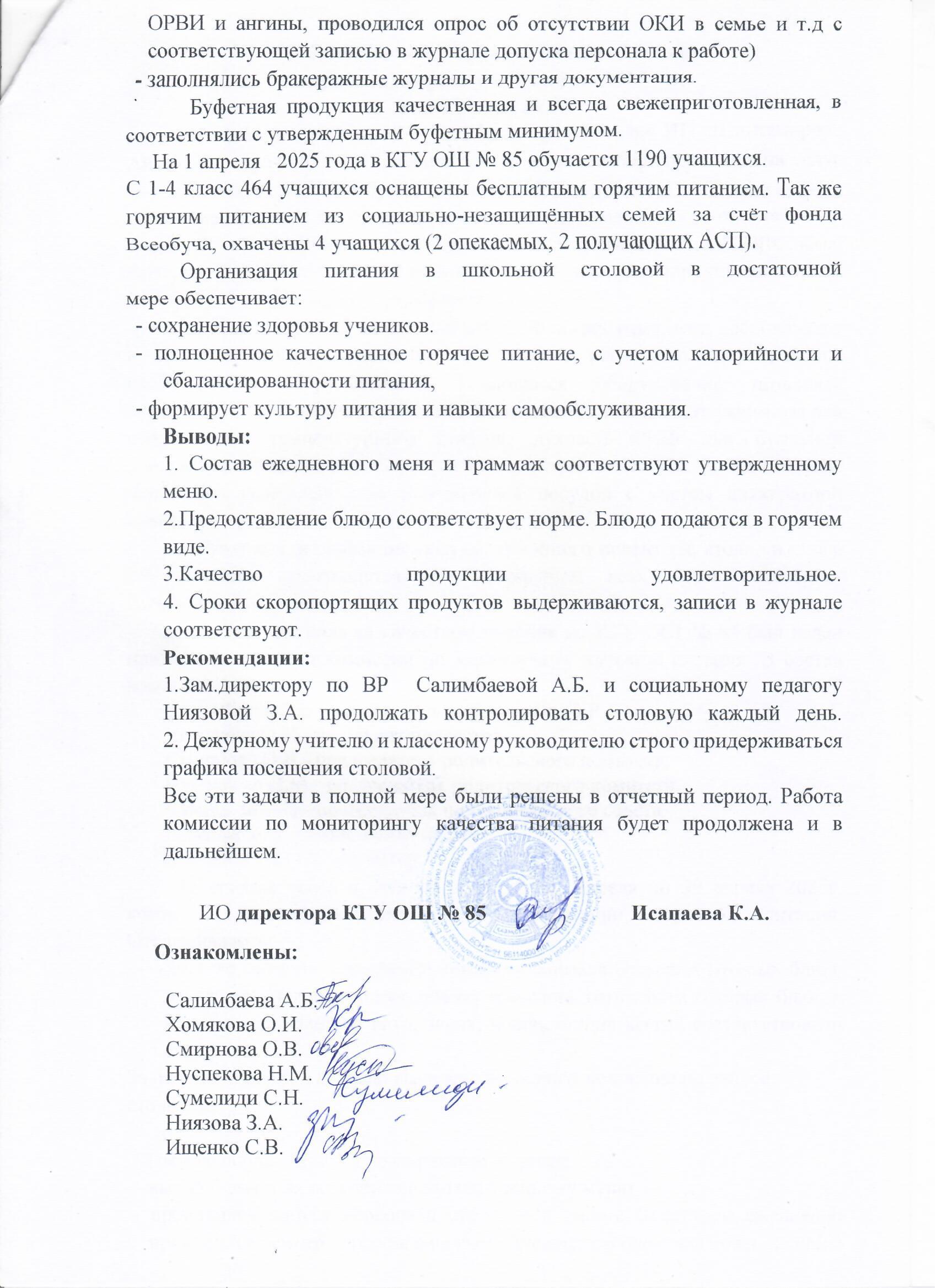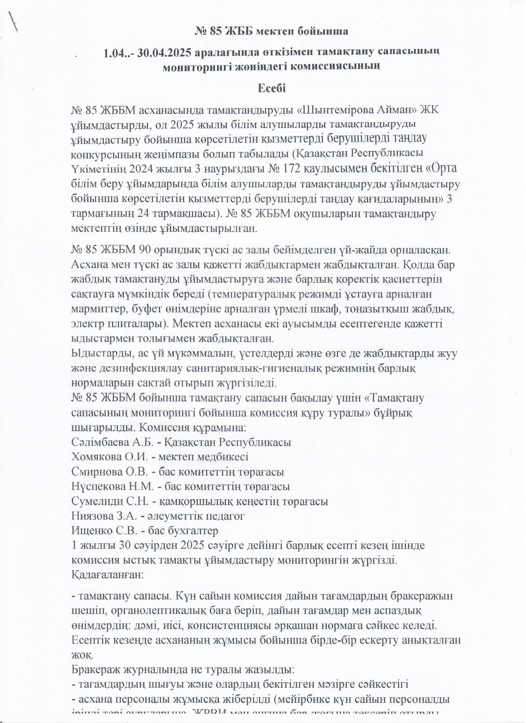 Тамақтану сапасының мониторингі жөніндегі комиссияның есебі » №85 Орта мектеп
