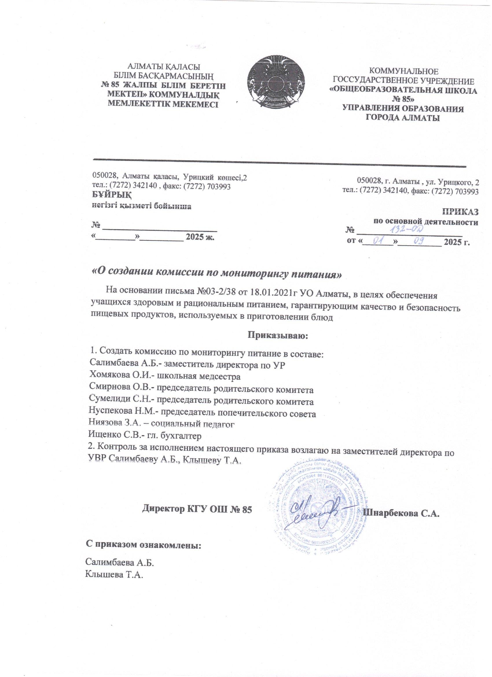 Тамақтану мониторингі жөніндегі комиссияны құру туралы бұйрық » №85 Орта мектеп