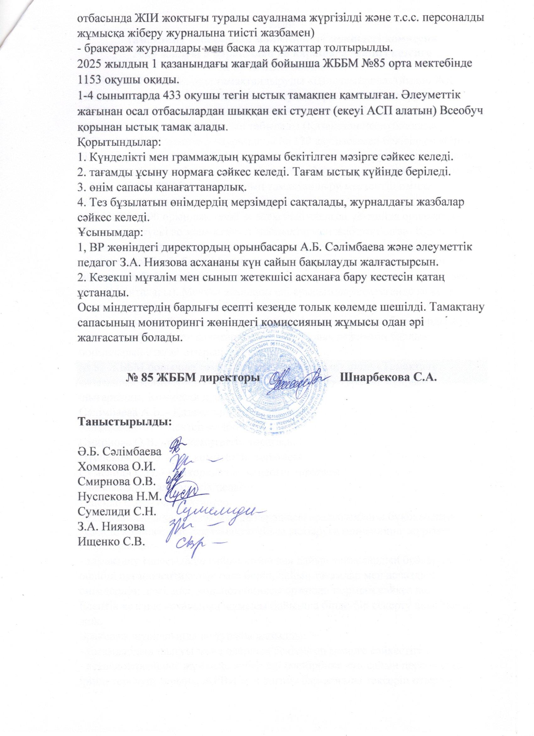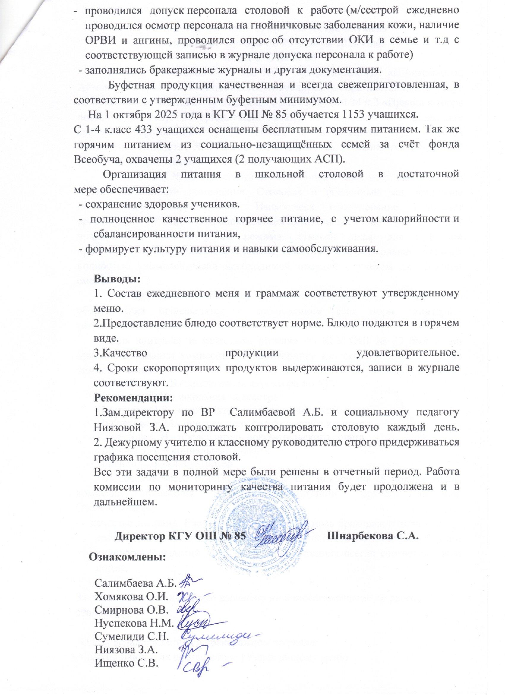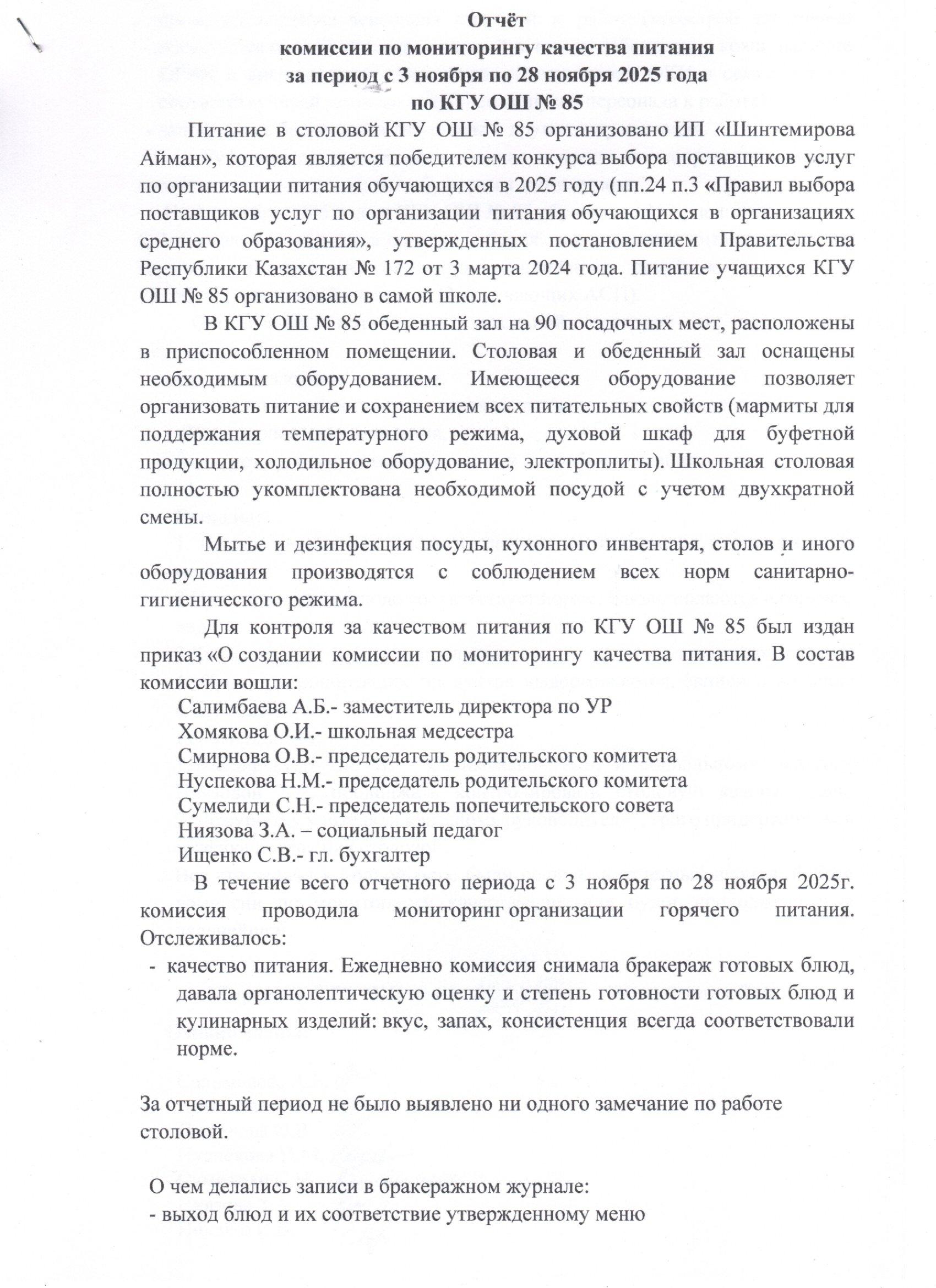 Тамақтану сапасының мониторингі жөніндегі комиссияның есебі » №85 Орта мектеп