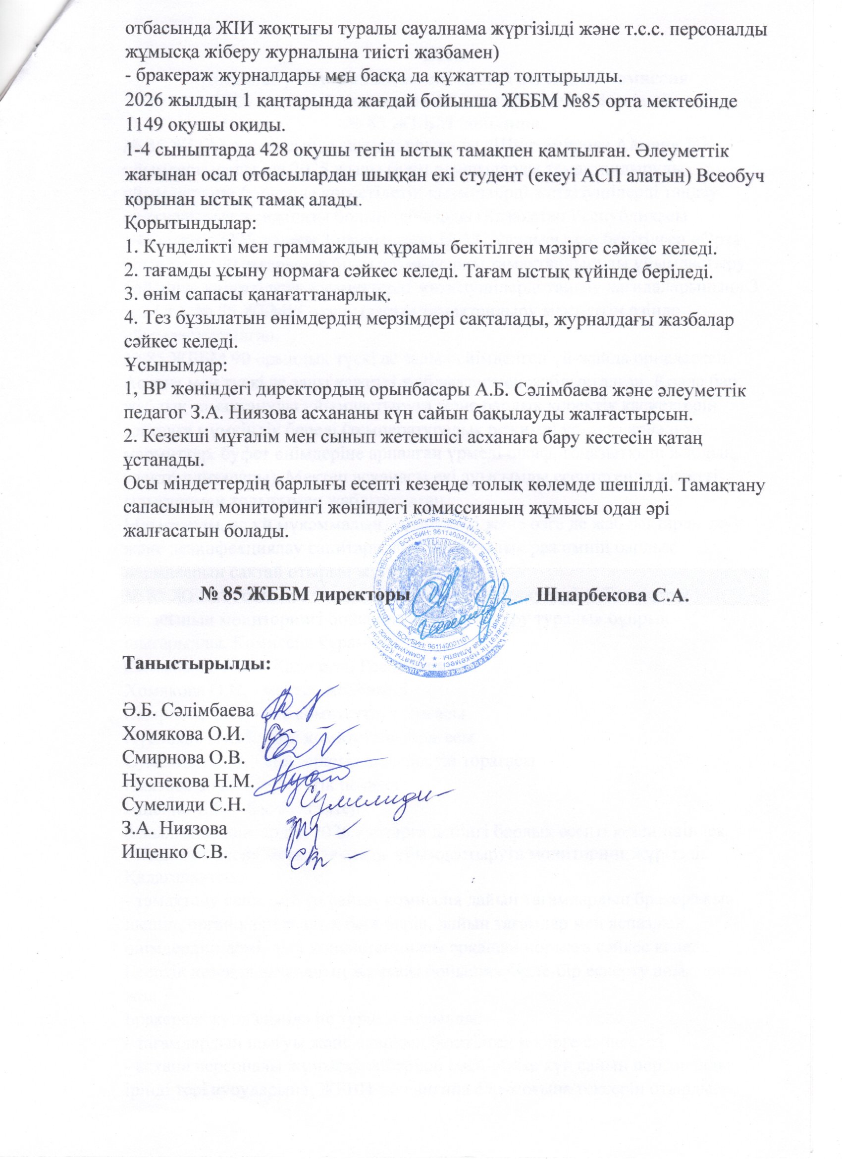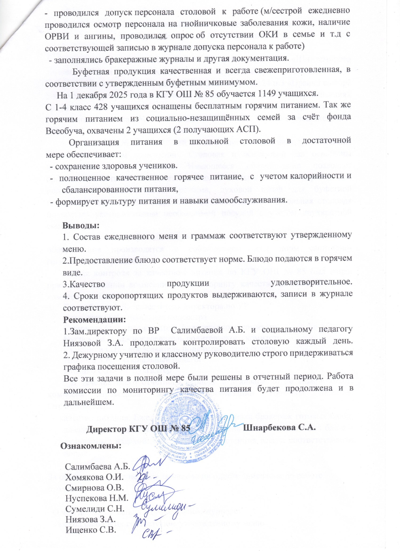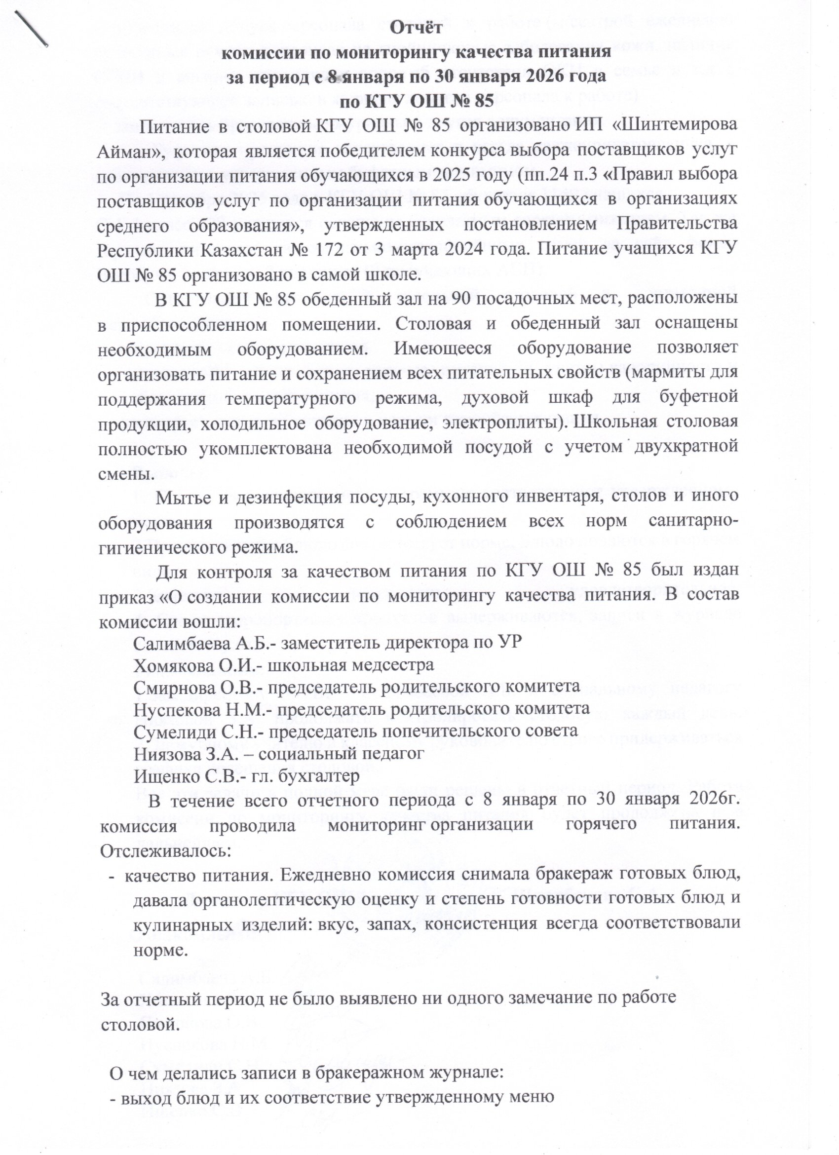Тамақтану сапасының мониторингі жөніндегі комиссияның есебі » №85 Орта мектеп